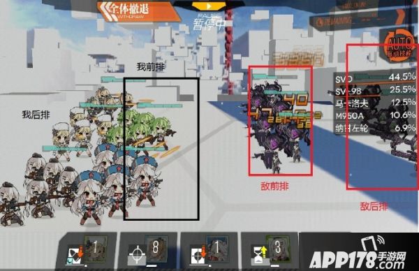 虽然不能手动选择目标,但是可以通过移动枪娘,使得敌我双方的攻击目标发生变化。从以上关于战场逻辑的简单论述我们可以引申出几个基本问题:敌人前后排配置的不同会导致我方的选枪布阵发生变化——如何根据敌人不同而选择恰当的阵型;敌人攻击逻辑的不同引发我方T位置的变动——如何T;白嫖时间的存在以及目标变动逻辑——手动操作的应用而这些将是我们下面将要讨论的东西
