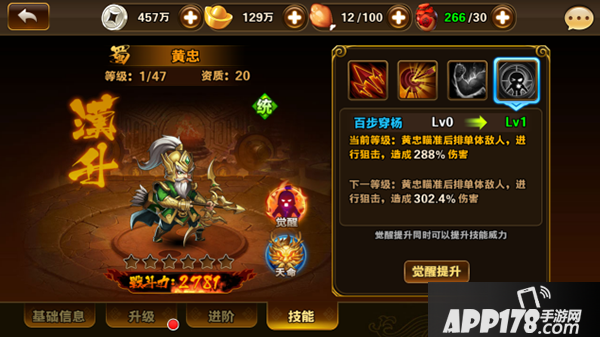 百步穿杨:黄忠瞄准后排单体敌人,进行狙击,造成288%伤害