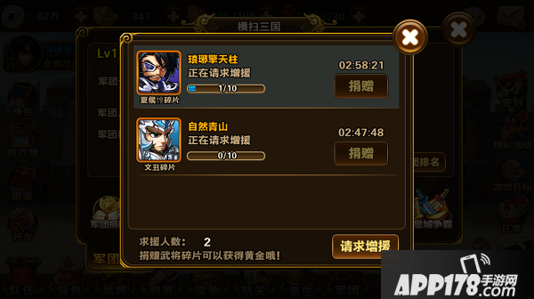 武将碎片凑不齐怎么办?没关系,只要加入军团,使用请求增援功能,就能在军团里获得其他军团成员为你捐赠的武将碎片,当然为你捐赠的成员也不是白捐,是会获得相应黄金奖励的。