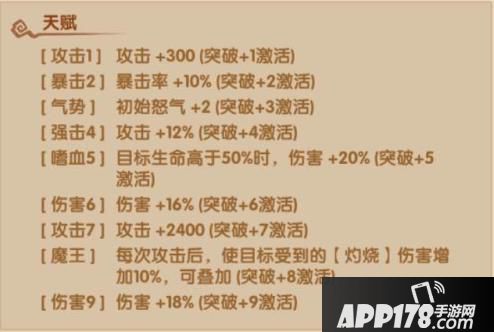 8.魔王:每次攻击后,使目标受到的【灼烧】伤害增加10%,可叠加(突破+8激活)