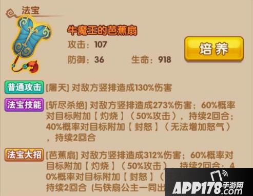 法宝大招:【芭蕉扇】对敌方竖排造成312%伤害;60%概率对目标附加【灼烧】(50%攻击),持续2回合;40%概率对目标附加【封怒】(无法增加怒气),持续2回合(与铁扇公主一同出战可触发)
