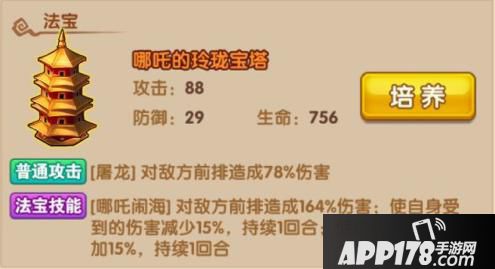 法宝技能:【哪吒闹海】对敌方前排造成164%伤害;使自身受到的伤害减少15%,持续1回合;使自身抗爆率增加15%,持续1回合