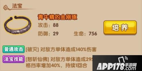 法宝技能:【怒斩仙佛】对敌方单体造成295%伤害;使自身格挡率增加40%,持续1回合