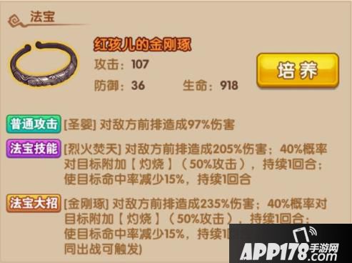 法宝大招:【金刚琢】对敌方前排造成235%伤害;40%概率对目标附加【灼烧】(50%攻击),持续1回合;使目标命中率减少15%,持续1回合(与青牛精一同出战可触发)
