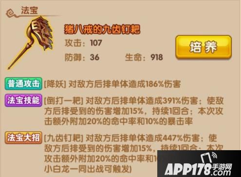 法宝大招:【九齿钉耙】对地方后排单体造成447%伤害;使敌方后排受到的伤害增加15%,持续1回合;本次攻击额外附加20%的命中率和10%的暴击率(与小白龙一同出战可触发)