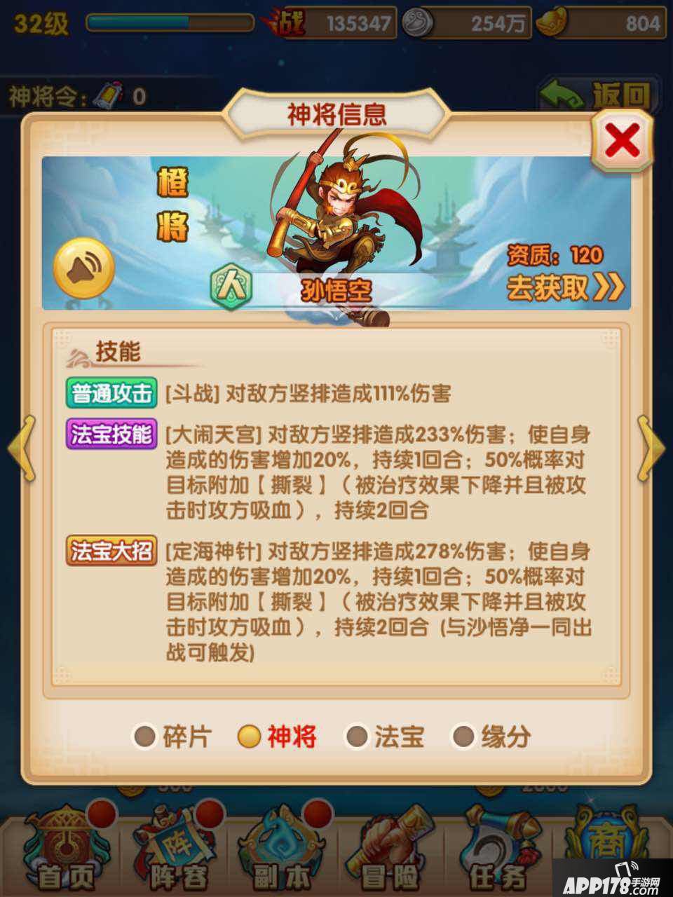 游戏和传统的卡牌并无什么区别,依然是收集强力神将,提升神将装备,法宝属性,根据不同神将属性技能合理搭配打败对手。操作也非常简单,战斗前调整好阵容,只需要选择战斗,全程无需动手,自动战斗。