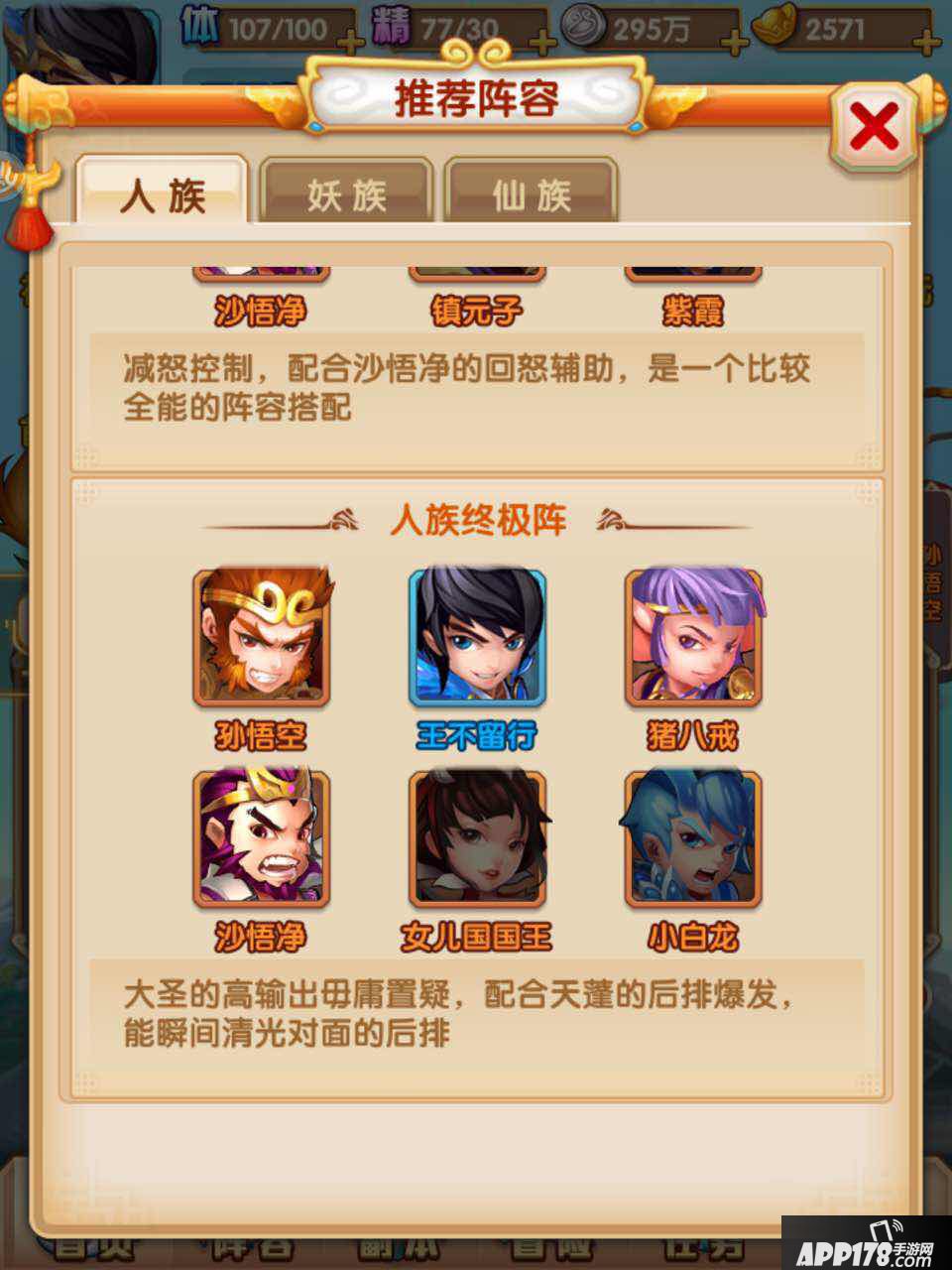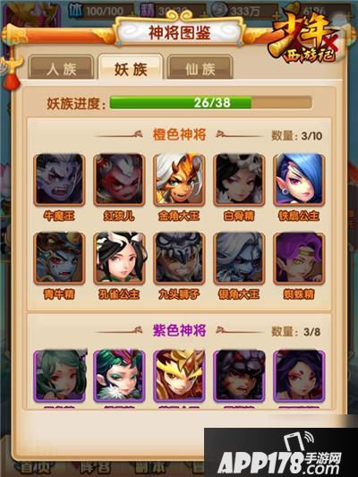 神将商店里刷出来的橙将都是随机的,那我们是不是第一个抽到什么就根据它来选阵容呢?小编的建议是,不。阵容选择应该与种族挂钩,种族选择的话,平民选择妖族,人族。低v党则是人族,妖族。v9以上的壕们,才玩仙族。玩妖族推图快,很适合平民玩家,而人族比较平均,所以0元党和低V皆可尝试。但是仙族前期并不强势,最厉害的120资质神将是个大坑,尤其托塔天王练起来非常麻烦,碎片少突破慢,不是土豪党很难跟上。当然这个建议并不绝对,毕竟游戏是要玩得开心,玩家喜欢选择自己所喜欢的神将上阵也是没有异议的。