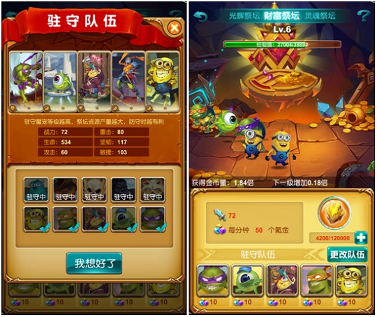 祭坛重地怎会少得了重兵看守呢?魔宠是最忠诚的守卫者,魔宠等级越高,资源产出越大,祭坛建设度提升也就越快,当建设度达到100%时,即可提升祭坛自身等级,那带来的效果将成倍增加。
