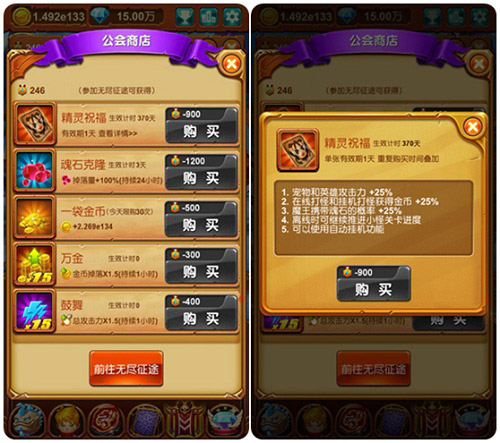 不管在什么游戏,月卡(天使祝福)都是RMB玩家首选的通关法宝,而在《十万个大魔王》中不花钱照样让你享受“RMB玩家”的待遇,只要你有公会,击败魔王收获荣誉勋章就可以在公会商店里免费兑换“日卡”精灵祝福,继而升级成月卡。