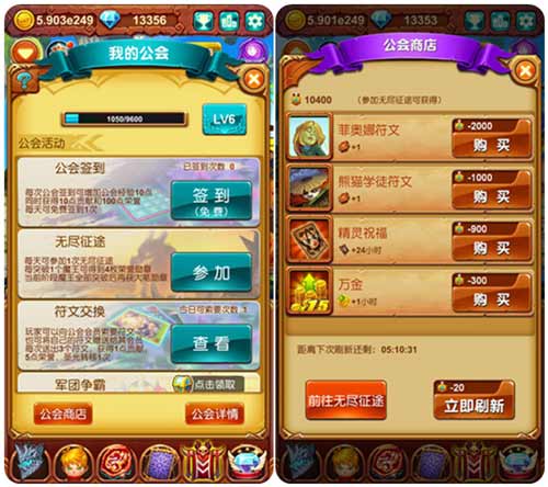 孤独冒险略显乏味,聚兄弟建公会共同抵御魔王大军。公会设有独立交流区,随时掌握公会专属战场(无尽征途、军团争霸)动态,快速调整攻打策略;公会签到、无 尽征途福利来袭,积攒荣誉勋章在公会商店中免费兑换各种游戏稀缺资源;符文交换助力公会成员共进退,提升魔宠战力,增加公会凝聚力。