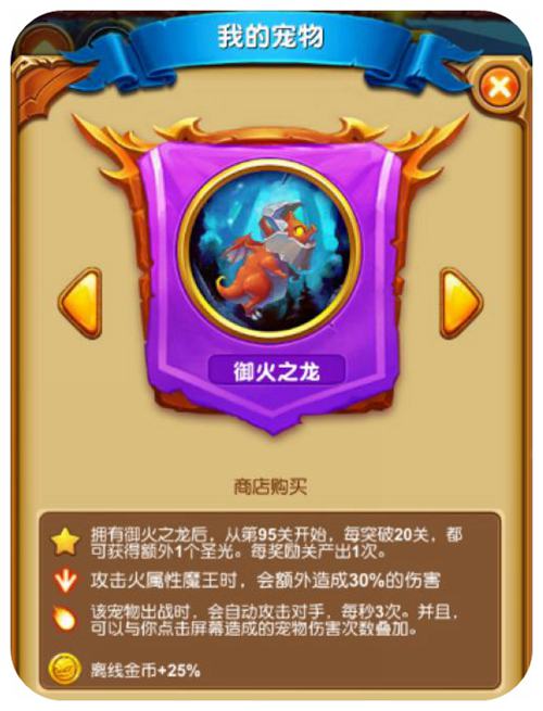 “御火之龙”,顾名思义,驾驭火焰,一切火焰在它面前都形同虚设,在攻击火属性魔王时,可以造成高额附加伤害,是各位勇者不可或缺的助力,在拥有御火之龙后,当离线时,还可获得25%的金币加成,这么好的赚钱利器,可攻击可赚钱,岂不乐哉!