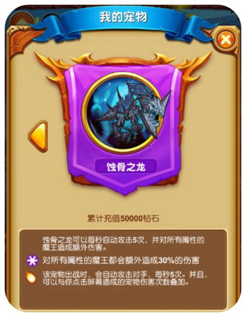 “蚀骨之龙”是三大龙宠中的最具攻击力的龙宠!为了战斗而生的蚀骨之龙,对所有属性魔王都会造成高额附加伤害,特色就是能战斗!攻击频率超快!比御火之龙、碎石之龙每秒还要多攻击2次! 是不可多得的战斗伙伴, 带上它,便可真真正正体验碾压的快感!