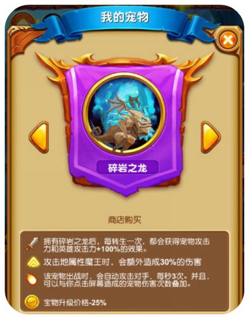 “碎岩之龙”,所谓“碎岩”,就是打碎岩石,所以在攻击土属性魔王时可瞬间破碎一切,对其造成高额附加伤害。此外,它独有的特殊能力,可减少宝物升级价格的 25%,如果恰巧做了御火之龙的守财奴,那碎岩之龙可是宠物界里会算计的商人。升级宝物时带上它,会帮你省下大笔金币!