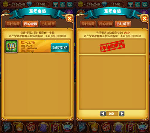 军团宝藏功能,带给大家的收获就是宠物进化所需要的材料以及万能符文。每位勇者每天有4次免费解锁宝箱次数以及6次协助解锁次数,也就是说玩家每天可以获得10次奖励。