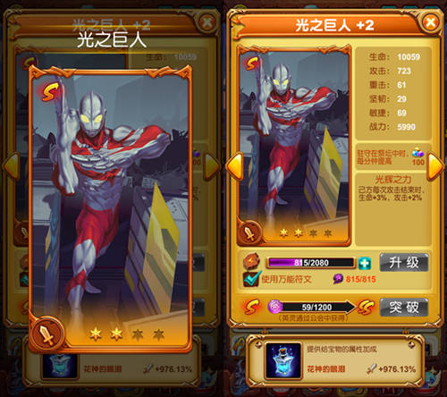 光之巨人来到魔王大陆,加入勇者们的阵营后,一度以魔宠伙伴的身份帮助大家,原本作为M78星云的强者,实力超级强悍,是为数不多的S级魔宠伙伴之一!高数值的属性面板一直是广大勇者喜爱它的原因!更是因为自身技能的原因,让它在队伍里担任着队长甚至领袖的重要位置!