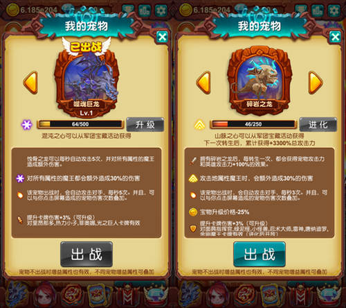 时装如果可以让勇者们华丽而强悍,那宠物的进化既可以让众多勇士重新认识的宠物的重要性,还可以依靠宠物的强悍再次登顶魔王大陆。原来萌萌的龙宠都摇身变成霸气的空中霸主,并且本身的属性也随着成长,终于变成了我们各位勇士最好的助手,而且最关键的是,宠物在进化后可以对魔宠卡牌进行加成,这对于喜欢挑战天梯赛的小伙伴们,无疑是巨大的帮助!