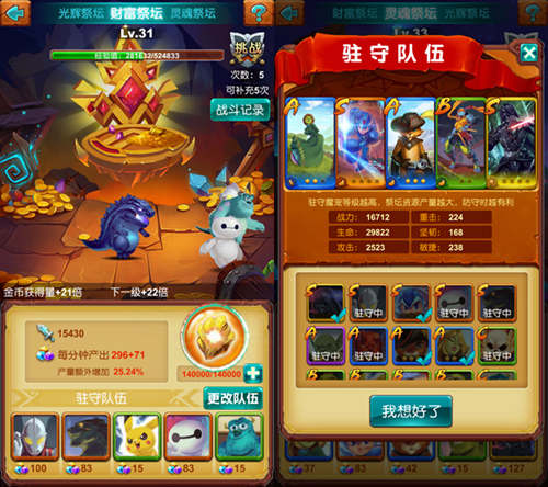 祭坛可以说是勇者们与神沟通最重要的环节,只有通过祭坛勇者们才能将自己的祈求送到神的心里。并且在祈祷过程中,诚心诚意的勇者们将会获得神的回应,为了报答勇者们如此虔诚的祈祷,神也将自己的部分神力降临到勇者们身上,用来帮助勇者低于魔王的入侵!三座祭坛分别可以为勇者们增加金币获得量,圣光援护效果以及英雄之魂的攻击力增加效果,可以说神为了提升勇者们的实力也是付出了不少心力!
