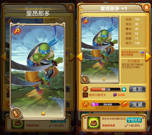神龟老大的战刀已经饥渴难耐了,勇者们快点将里昂那多放到队伍中,他将成为你队伍中的一把尖刀,直逼敌人而去,带给敌人巨大的伤害!