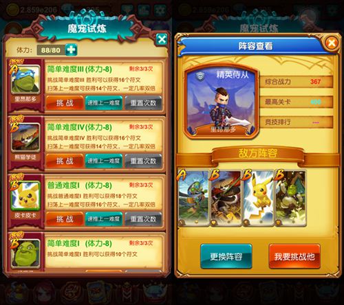 但是再强势的魔宠,不好好培养怎么行?魔宠试炼,锻炼魔宠最佳场所,来到这里的魔宠都将从菜鸟小白成长为独当一面的大侠!但是各位勇者需要注意的是,魔宠试炼是分难度的,难度越高试炼完毕获得的材料越多,所以勇者们一定要先将魔宠试炼挑战到自身可以达到的最高难度,然后开始扫荡,保证得到的材料是最多的!