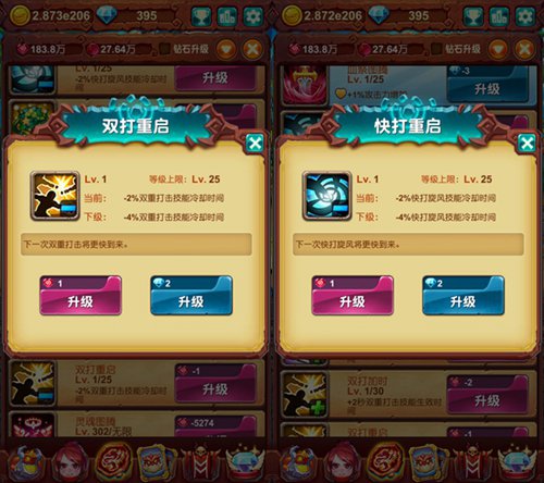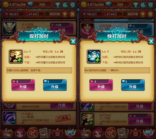 首先可以为技能增幅的图腾分为两大种类,一种是可以增加技能持续时间的,比如“快打加时图腾”“双打加时图腾”。当你拥有一个满级的“快打重启图腾”时,你的技能“快打旋风”持续时间从原来的20s增加到30s时,我们在闯关中的优势可是很大的,试想一下,本身你闯关只有1e的伤害,使用完技能之后攻击力会变成1.5e而且持续时间很长,这就让你有了一次冲刺的机会,可以利用技能释放的合理时间,闯过阻挡我们的难关!