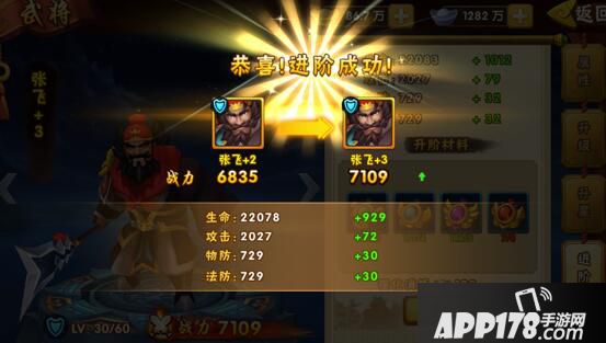 点击进阶按钮。如果当前道具足够的话,扣除一定数量的道具可完成进阶。进阶成功后可提升武将属性。