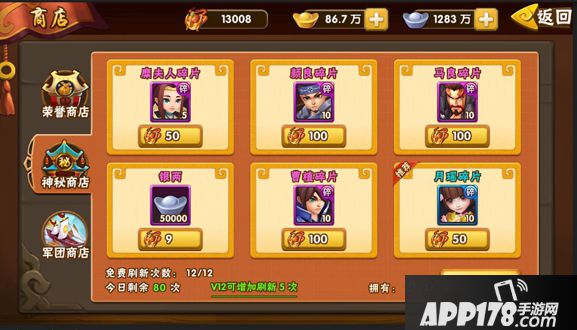 新人玩家很容易漏掉一个事情,就是刷新神将商店!这个非常重要,刷将很大程度上就指望神将商店了。神将商店可以刷出橙将碎片,也有概率出整将。平时攒将魂的话,遇到主力阵营的整将可以立即下手!不要等自动刷新没了就亏了。