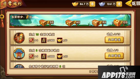 小红点全部点完了之后,可以看下日常任务中还有什么没有做,查漏补缺。完成每日任务可以获得积分,积分达到一定数量可以开启每日积分宝箱。积分宝箱内有元宝和体力丹是一定要拿到的。
