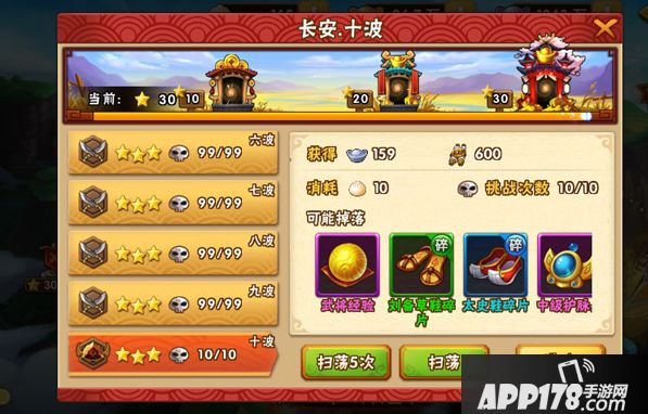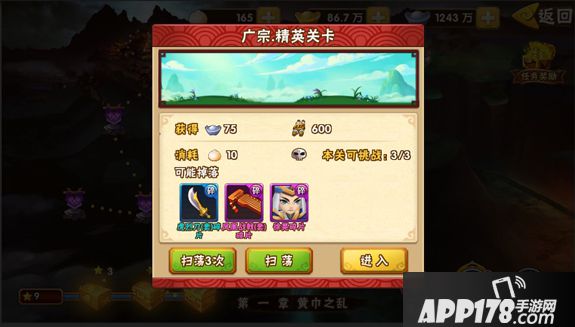 挑战剧情副本,可以获得大量的资源,包括武将经验,银两,武将碎片,装备碎片和进阶用的护脉丹。前期剧情副本难度不高,每日每关都重置,每关可扫荡5次。固定获得最基础的资源,每天上线后记得尽早打晚。