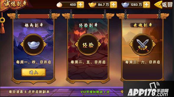 试练副本每天开启内容不同,每天可以获得大量资源。记得攒足体力,一定要进行哦~