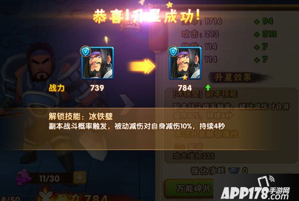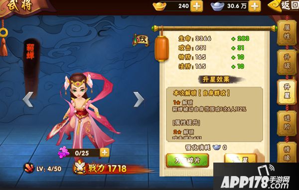 点击升星按钮。如果当前武将碎片足够的话,扣除一定数量的碎片完成升星。碎片相应升级后可解锁相应星级的技能。