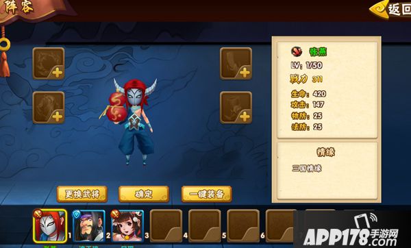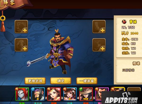 进入阵容界面,阵容界面显示武将基本属性,装备,和情缘