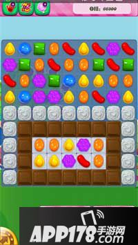 通关攻略:在这一关,出现了新元素“巧克力块”,它的功能是,如果在一个步骤循环中,没有消除任何巧克力块的话,巧克力块会在周围的糖果中,随机感染一个糖果,使其变成巧克力块。这一关除了新元素,到是没有什么难的,三星可以期待的。