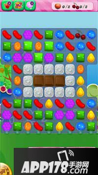 通关攻略:这一关没有说明难度,首先要将两种水果尽量移到中间来,尽量能够将巧克力和岩石消除掉,一次通关不了就多试几次。