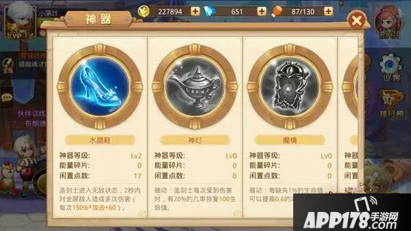 首先,大家不要误解了“神器”两个字,童话里的“神器”它不是一个武器哦,它更像是传统游戏里的天赋系统的升级版:每一件神器都对应一个天赋技能(注:不同的职业会获得不同的能力,除了水晶鞋是加强各职业的怒气技能的,其他神器附带的都是被动能力),同时通过升级神器还可以获得能量点来加成玩家基础属性。