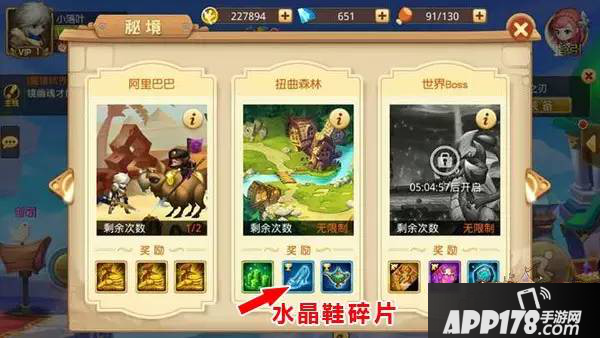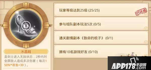 不同的神器有不同的开启条件,点击未开启的神器就能看到对应的开启条件,要达成所有的条件才成功解锁。如下图所示水晶鞋的开启条件: