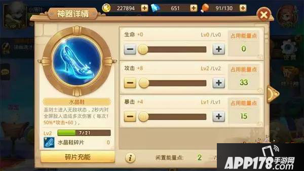 举个例子:如上图,神器水晶鞋给圣剑士带来的增幅是:圣剑士进入无敌状态,2秒内对全屏敌人造成多次伤害(第一个神器技能对应职业怒气技能,职业不同神器技能也不同);通过碎片充能获得能量点后还能用来增加圣剑士的生命、攻击、暴击。