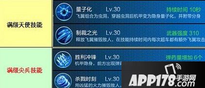 表二是满级的天使和满级突击尖兵技能属性对比表。天使带来了全新的技能:量子化和制裁之光,其中量子化技能持续10秒但不锁油,且机甲隐身。