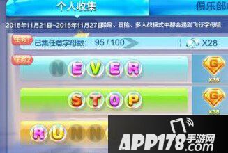 以上便小编带来的天天酷跑11月字母收集活动攻略,玩家欲知更多游戏内的攻略与资讯,敬请关注APP178手游《天天酷跑》专区。