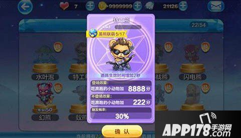 特工熊是出现,开启了一个不一样的加分方式,也出现了一些高分组合。技能触发,吃到每一个奔跑的动物,都会得到8888分,加分实力很强大。现在特工熊限时上架神秘商店精品屋,只要获得精品券2张,就可以兑换,小伙伴千万不能错过这款强大的精灵。