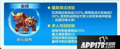 地心战熊的表现跟高不高,要看玩家吃多少奔跑动物啦,吃的奔跑动物分越高加成就越多,并且地心战熊触发技能好能带来火球,火球也是玩家得分的有利因素之一,从地心战熊的属性上可以看出来,这款坐骑还是很强大的,无论是得分还是搭配,都很容易入手。
