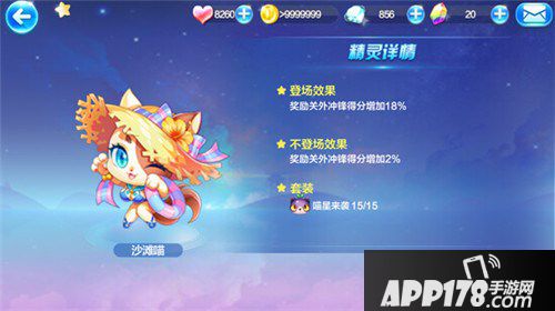 使用沙滩喵时,另一个需要注意的就是奖励关外的限制。也就是说角色必须在奖励关外冲锋,才能触发这个精灵的加分效果,所以用沙滩喵时,需搭配纯出奖励关外得分的组合,技能在障碍多的路段使用,使用时注意避开各种奖励关以及巅峰挑战。