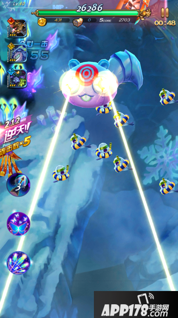 本关Boss是一只魔性的精灵,魔化之精。用疯狂和残暴来形容它再合适不过。它会发射红蓝两色的光弹,尽管霸占屏幕的速度很慢,但威力不俗且难以躲避。它还会从两眼射出威力巨大的激光,激光快速旋转覆盖屏幕各个角落,真可谓“目露凶光”。