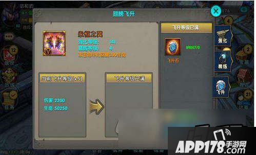 1.背包中选择一个翅膀点击强化按钮,在装备强化的右方选择飞升按钮即可进入飞升界面。