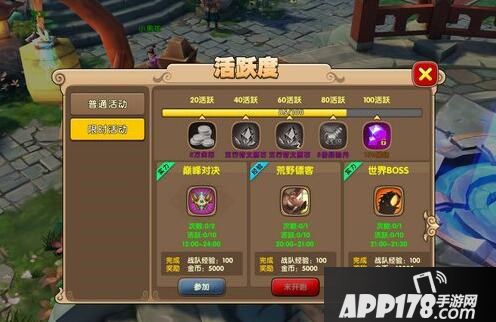 3、世界BOSS:每天参加1次世界BOSS可以获得10点活跃度,注:世界BOSS21:00-21:30开启