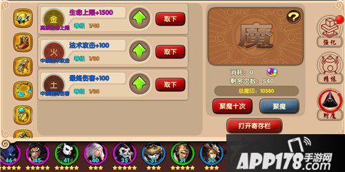 聚魔分为单次聚魔和聚魔十次,如果点击聚魔十次系统会自动炼化掉绿色和蓝色品质的附魔,保留紫色、橙色品质附魔(注:点击聚魔十次,如果系统在第二次即刷新紫色或橙色附魔,则该轮只进行两次聚魔,并非十次只能获得一个附魔)。在初期,建议玩家使用单次聚魔,出现绿色、蓝色的属性可以留给副将,待所有镶槽都满了之后,再使用十连功能。