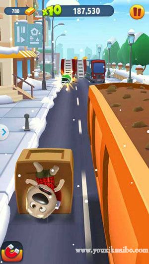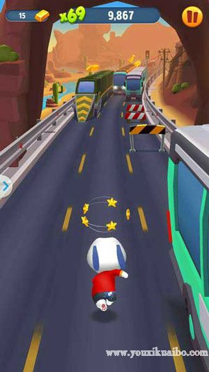 与很多跑酷类手游“一碰障碍物即狗带”的严苛设定不同,玩家体验《汤姆猫跑酷》时,如果在接触障碍物的瞬间进行躲闪,角色只会进入眩晕状态,不会被判定失败。但是,眩晕状态下的角色一旦再次触碰障碍物,便会直接扑街。因此,一旦玩家因操作失误让角色眩晕,就必须在其恢复常态前更加谨慎,无论是变道撞到旁边的障碍物,还是继续进行玩心跳的操作,都极有可能让你的这次跑酷之旅马上结束。
