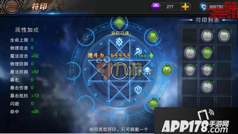 2、符印种类:生命上限、物理攻击、魔法攻击、物理防御、魔法防御、命中、闪避、暴击、暴击抵抗、暴击伤害,这10种类型。