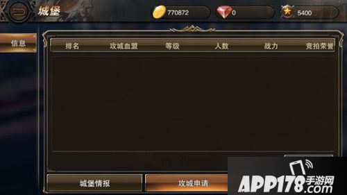 3、攻城申请:只有未占领城池的血盟盟主可以开启攻城战,盟主们可以通过“挑战类”面板下的“城堡”按钮进入城堡界面,选择想要攻占的城堡并提交“攻城申请”,系统将根据竞拍荣誉排名,决定最终可以进行攻城战的两大血盟。