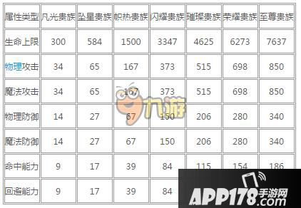 贵族特权属性加成一览表: