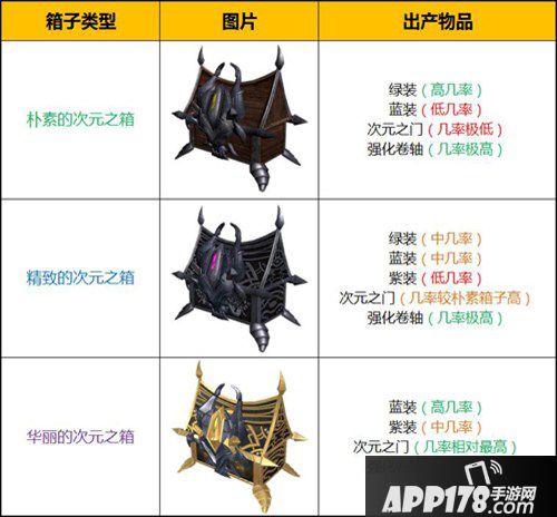 宝箱分为华丽的次元之箱、精致的次元之箱、朴素的次元之箱三种,每种宝箱又分20级、30级、40级、50级宝箱,打不同等级和不同种类的宝箱可以获得不同等级和品质的装备。以20级箱子为例,华丽的次元之箱有机会爆出D20蓝紫装,精致的次元之箱有机会爆出D20绿蓝紫装,朴素的次元之箱有机会爆出D20绿蓝装。还都会有几率掉落装备、强化卷轴,是每位走向强者之路必备的物品!